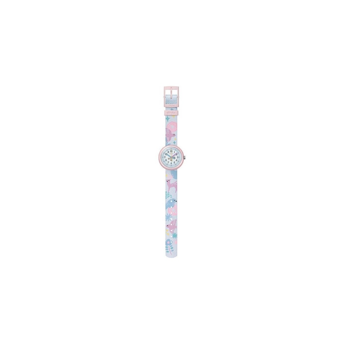Flik Flak Kinderuhr Magical Forest das Stoffarmband ist mit niedlichen pastellfarbenen Tieren verziert.