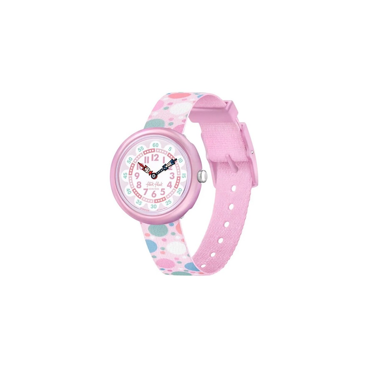 Flying Bubbles Kinderuhr mit mehrfarbigem Stoffarmband, 32 mm rosafarbenem Gehäuse aus biobasiertem Kunststoff und weißem Zifferblatt. Schnallenverschluss.