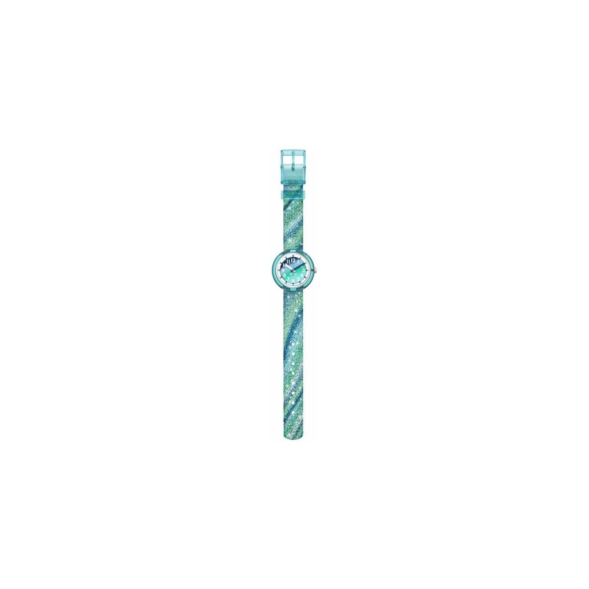 Diese Uhr aus der Flik Flak Organized Chaos-Kollektion für Kinder besteht aus einem Armband aus recyceltem PET-Gewebe in wunderschönen Grün- und Blauglitzertönen. Es verfügt über ein 31,85 mm großes blaues Gehäuse aus biobasiertem Kunststoff und ein blaues Zifferblatt mit weißen Ziffern.