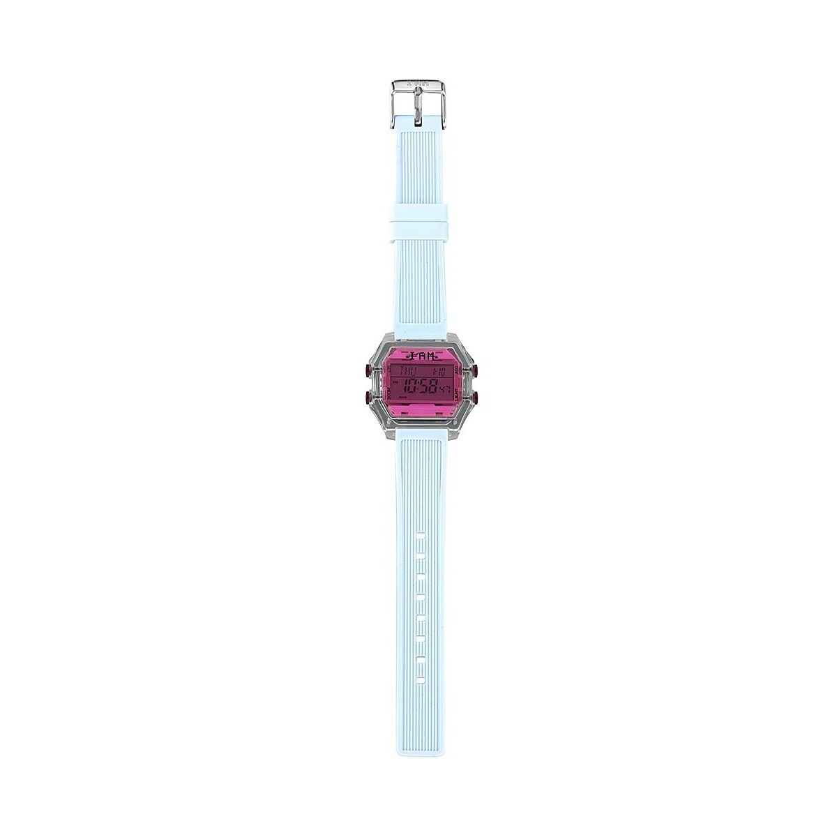 IAMTHEWATCH Digitaluhr mit grauem transparentem Polycarbonatgehäuse mit pinkfarbenem Glas und hellblauem Silikonarmband mit Stahlschnalle.