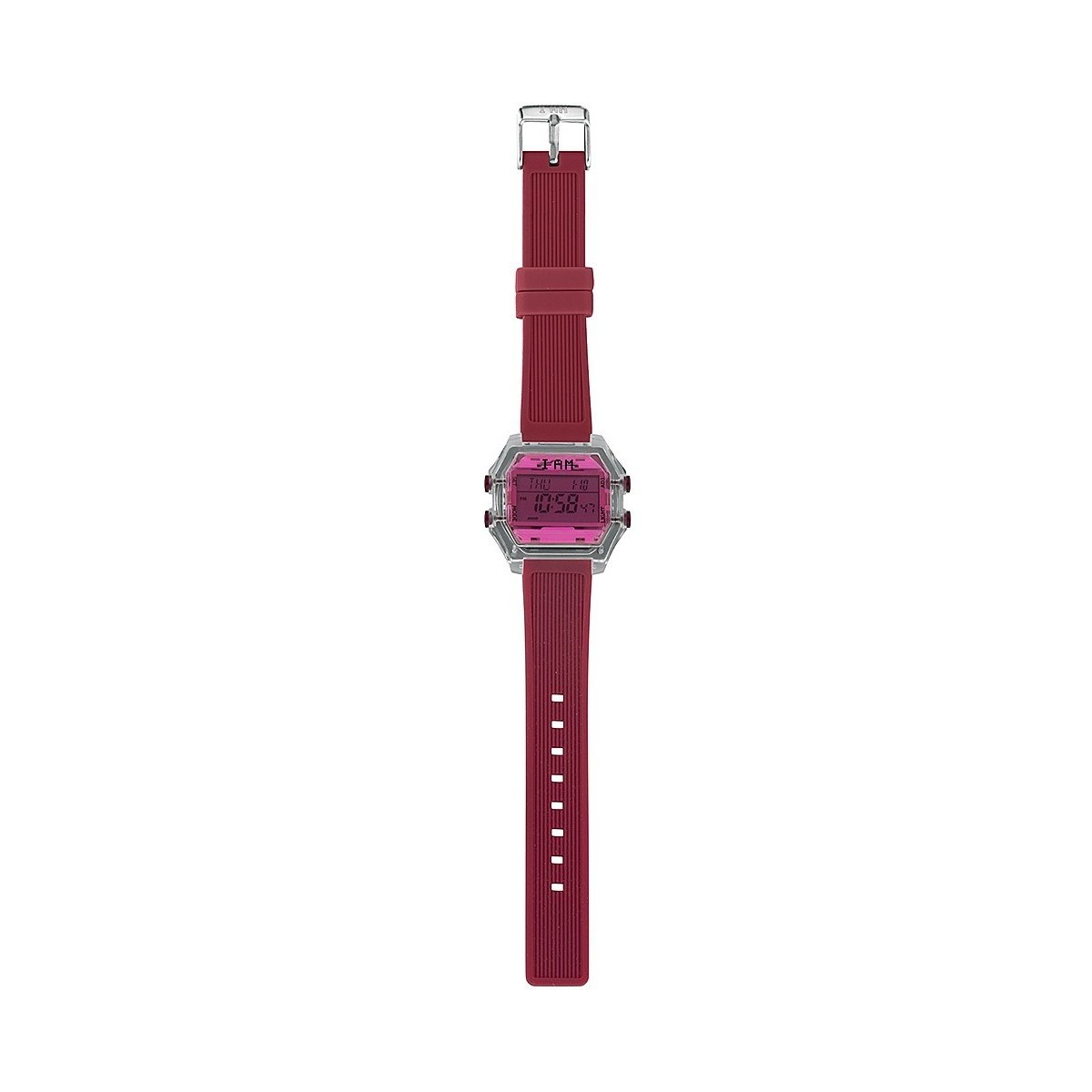 IAMTHEWATCH Digitaluhr mit grauem transparentem Polycarbonatgehäuse mit pinkfarbenem Glas und rotem Silikonarmband mit Stahlschnalle.