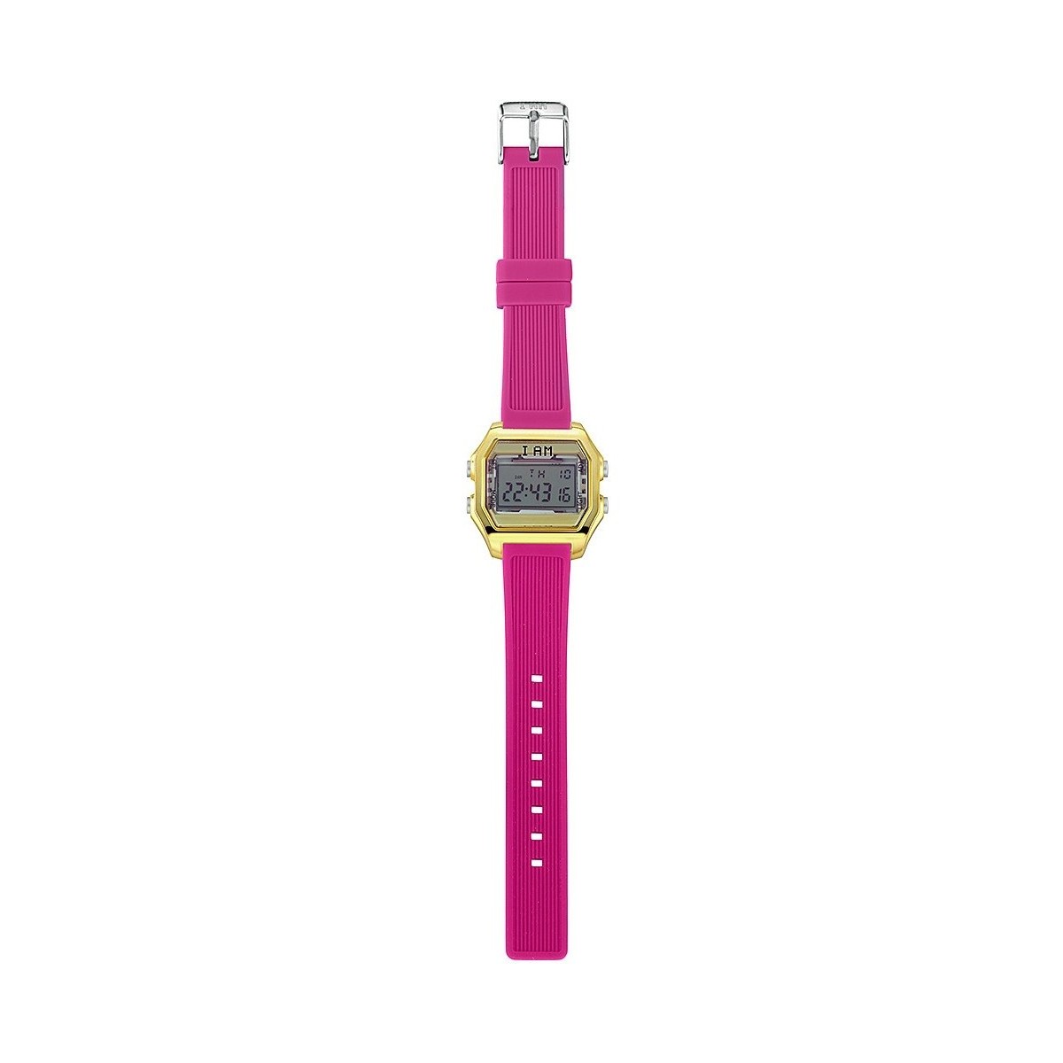 IAMTHEWATCH Digitaluhr mit Polycarbonatgehäuse, goldfarbenem Metalleffekt mit grauem Glas und pinkfarbenem Silikonarmband mit Stahlschnalle.