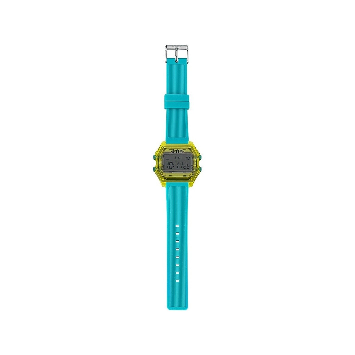 IAMTHEWATCH Digitaluhr mit transparentem Effekt, gelbem Polycarbonatgehäuse mit grauem Glas und hellblauem Silikonarmband mit Stahlschnalle.