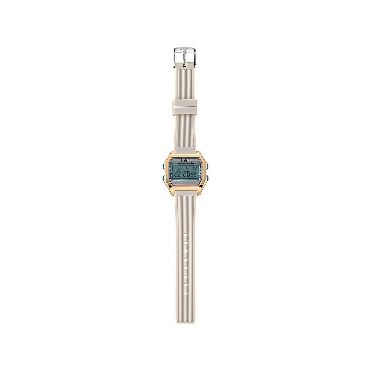 I AM Damen Digitaluhr mit Polycarbonatgehäuse in Metall-Effekt-Farbe Rotgold mit blauem Glas und grauem Silikonarmband mit Stahlschnalle.