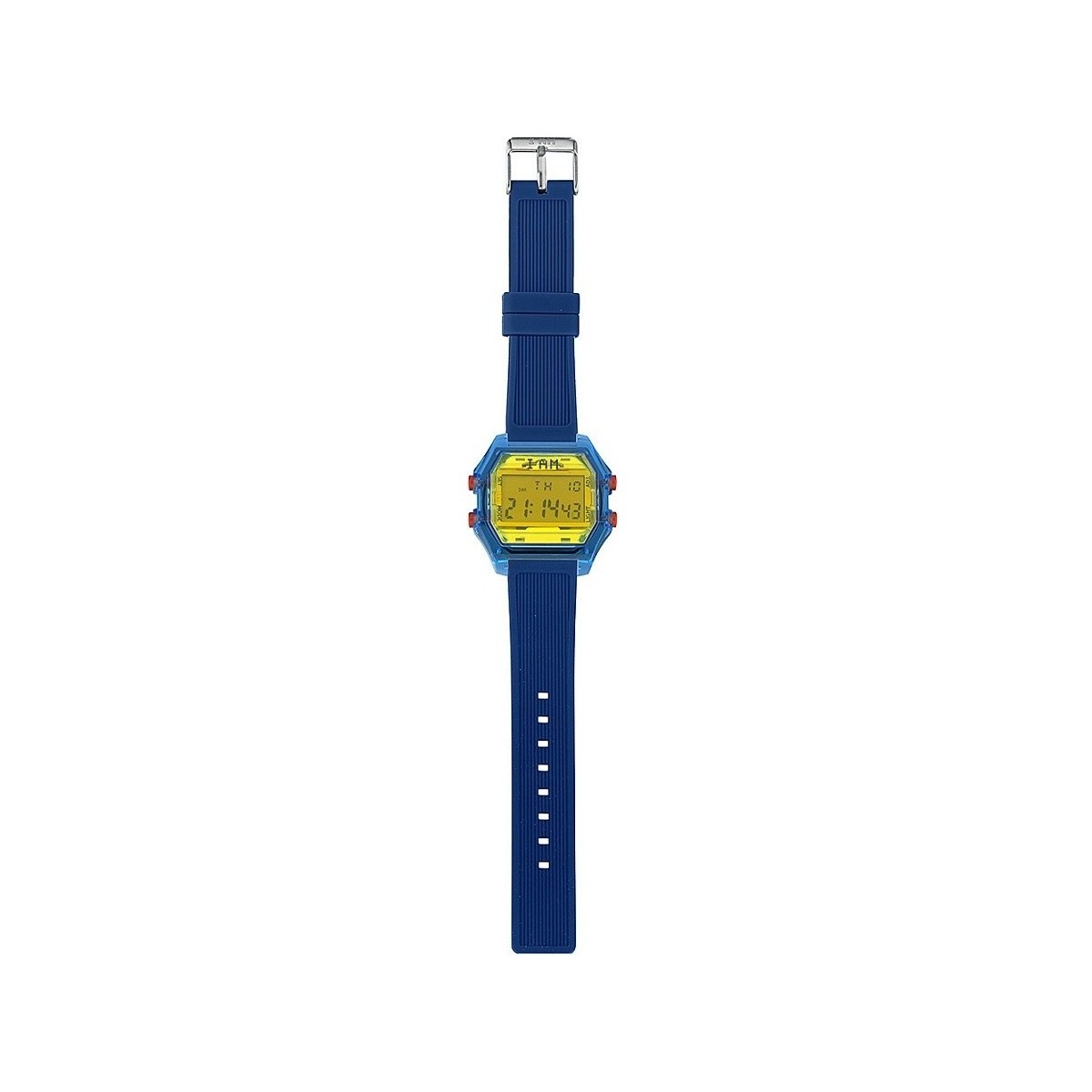 I AM Herren Digitaluhr mit transparentem Polycarbonatgehäuse, blauer Farbe mit gelbem Glas und blauem Silikonarmband mit Stahlschnalle. Funktionen: Monat, Datum, Morgen / Nachmittag, Licht, Klingelton, Stoppuhr, Zeitsignal, 12/24-Stunden-Zeitplan. Die Wasserbeständigkeit beträgt 5 atm. Uhr mit J8519 Digitalwerk ausgestattet. Uhr zusammengesetzt aus Bargeld Ref. IAM-106 E Gurt Art.-Nr. IAM-302.