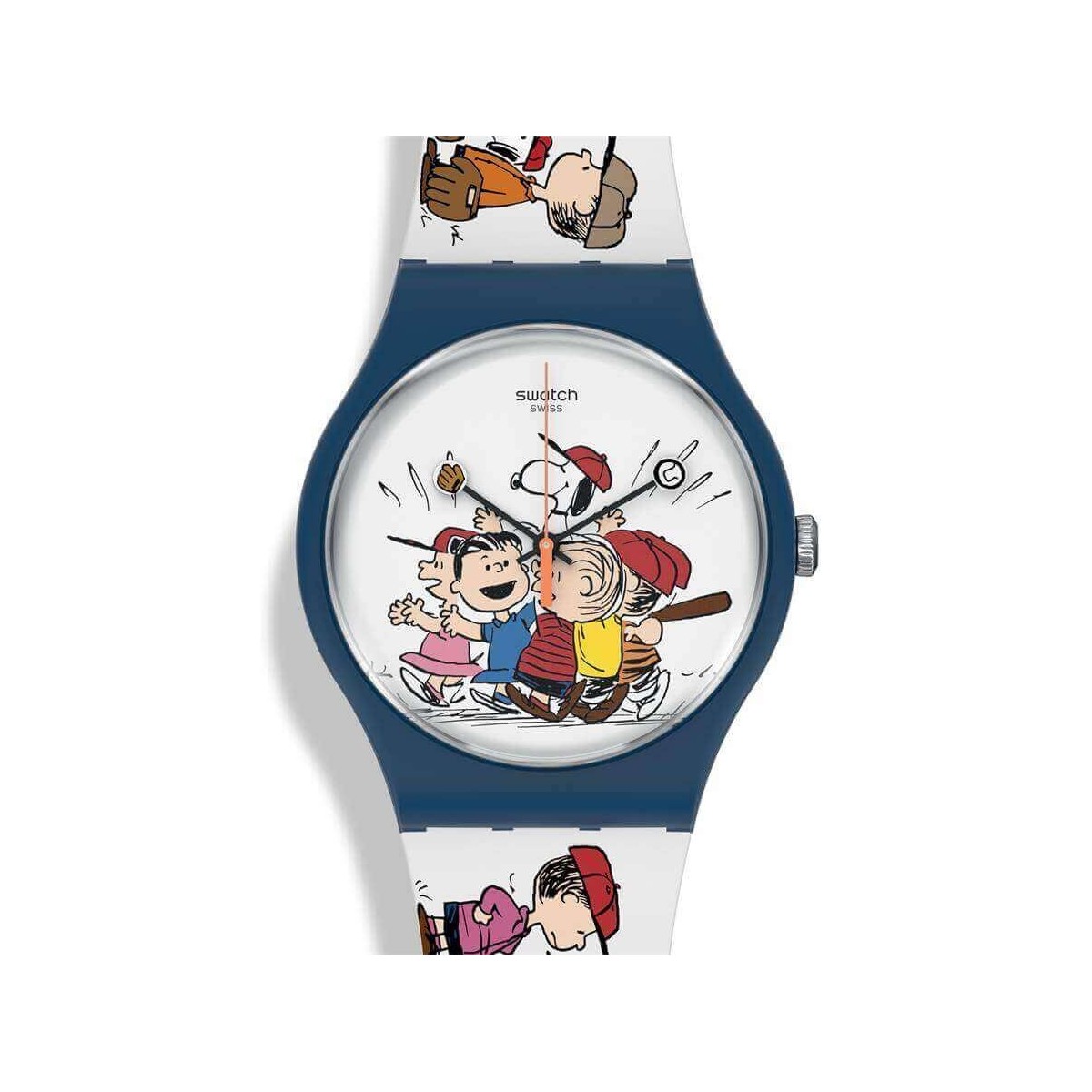 Aus einer Swatch-Zusammenarbeit mit Peanuts entstand die First Base-Uhr mit Nur-Zeit-Funktion und Quarzwerk. Die Uhr hat ein weißes Silikonarmband mit einem Aufdruck der berühmten Peanuts-Band, ein Motiv, das wir auch auf dem Zifferblatt finden, das durch Zeiger mit Baseballball- und Handschuhaufdruck bereichert wird.
