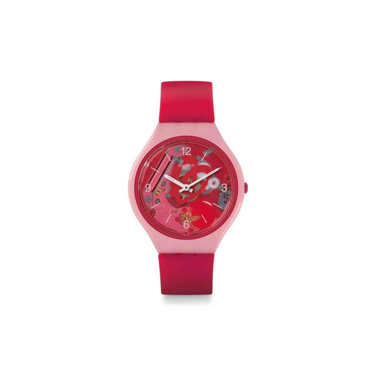 Die Uhr hat ein rosafarbenes Silikonarmband mit einem ultradünnen 36,8-mm-Gehäuse aus reinrosafarbenem Kunststoff und einem skelettierten Zifferblatt, das den Blick auf das Uhrwerk freigibt, sowie ein zentrales Herz, das die weißen Zeiger hält.