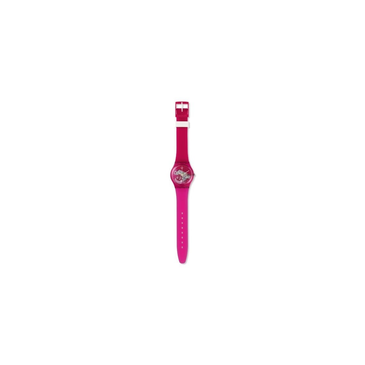 Swatch-Uhr aus der Grana-Tech-Kollektion mit Zeitfunktion und Quarzwerk. Die Uhr hat ein schönes und jugendliches fuchsiafarbenes Silikonarmband mit Kunststoffschnallenverschluss und einem transparenten fuchsiafarbenen mittelgroßen Gehäuse, Zifferblatt mit weißen Zeigern.