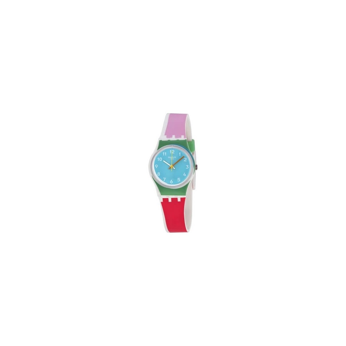 Swatch-Uhr aus der De Travers Lady-Kollektion mit Zeitfunktion und Quarzwerk. Die Uhr hat ein schönes und jugendliches Armband mit einer weißen Basis am Rand, hellrosa oben und einem helleren rosa unten, mit einem weißen Kunststoffschnallenverschluss, einem kleinen glänzend weißen Gehäuse mit grünen Motiven, einem blauen Zifferblatt und Aquamarin und mit orangen und gelben Händen.