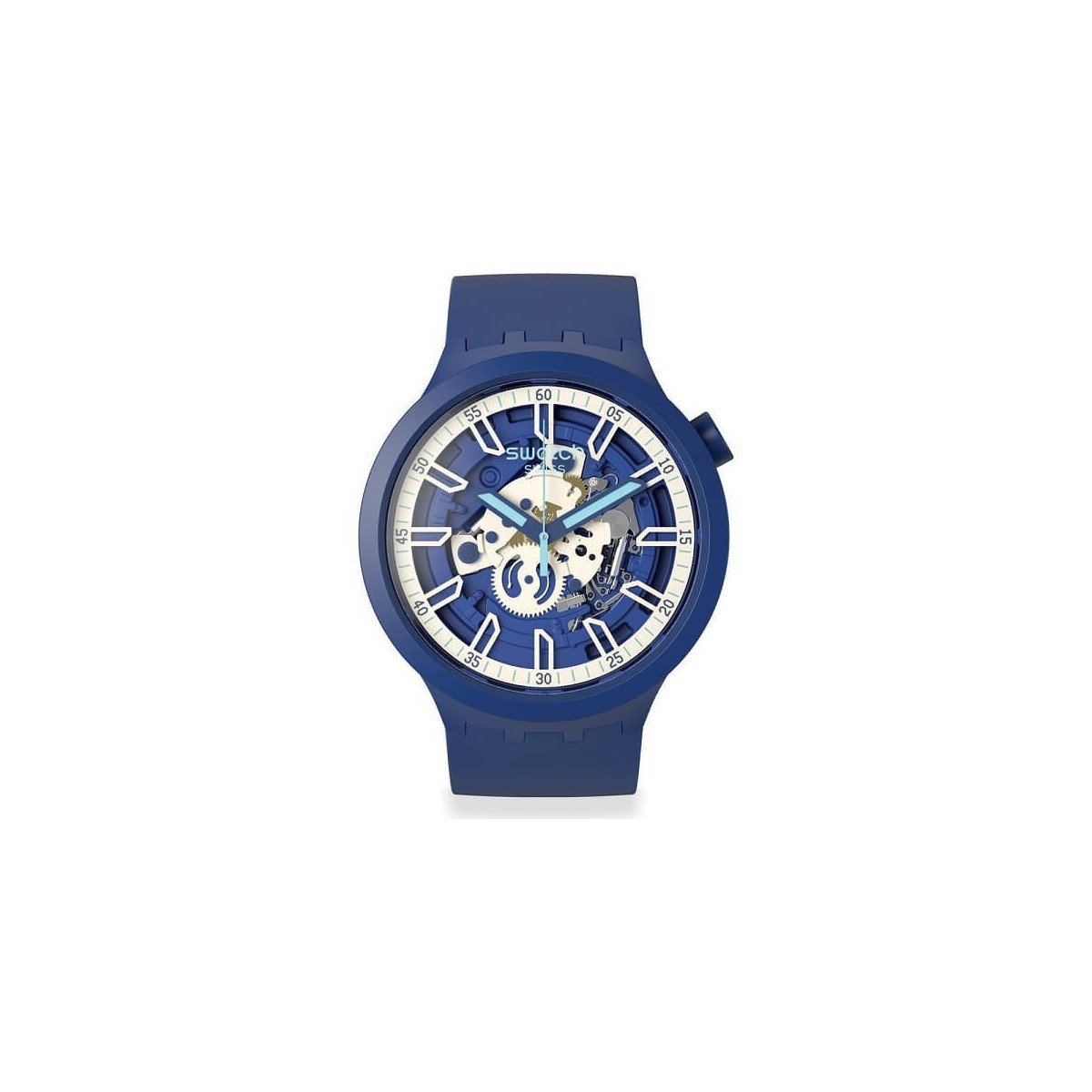 Swatch Iswatch Blau 47 mm Big Bold mit transparentem Zifferblatt, robustem Kunststoffgehäuse und blauem Silikonarmband; Quarzwerk