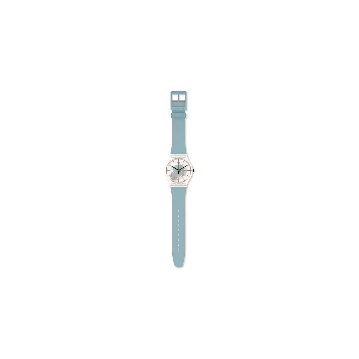 Swatch-Uhr aus der Monthly Drops New Gent-Kollektion mit Quarzuhrwerk, rundem 41-mm-Kunststoffgehäuse in transparenter Farbe und hellblauem Silikonarmband