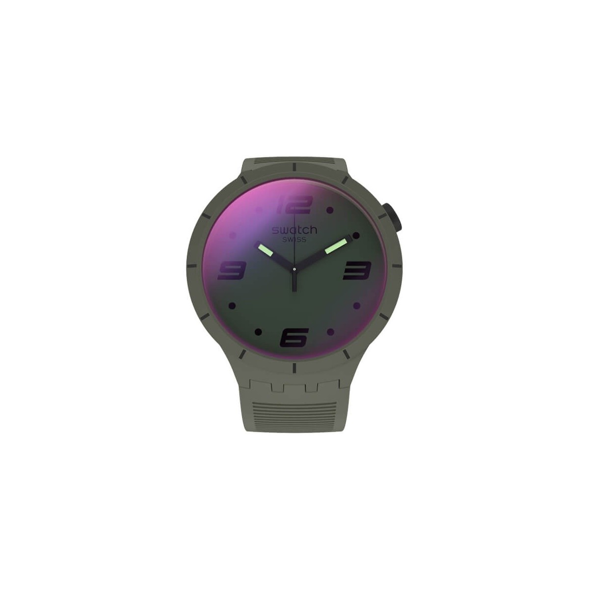 Swatch futuristische grüne Uhr aus der Big Bold-Kollektion mit Quarz-Chronometerwerk, grünem Kunststoffgehäuse und runder Form von 47 mm und khakigrünem Silikonarmband