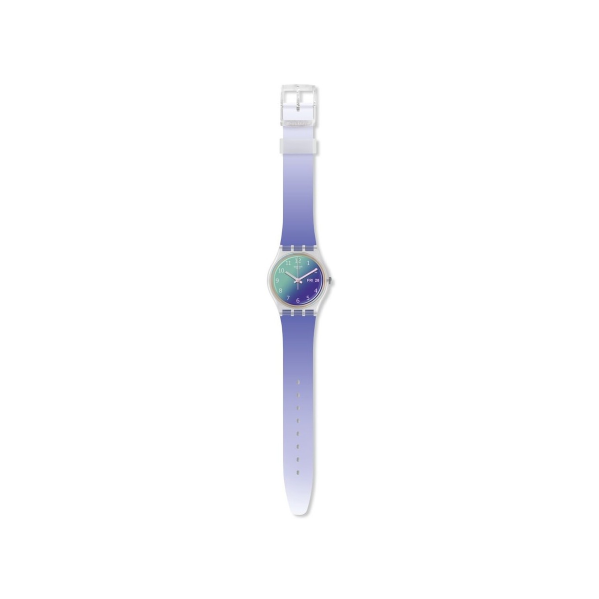 Swatch-Uhr aus der Ultralavande-Kollektion mit Zeitfunktion und Quarzwerk. Die Uhr hat ein schönes und jugendliches weißes und violettes Silikonarmband mit Kunststoffschnallenverschluss und rundem transparentem Kunststoffgehäuse, violettes Zifferblatt.