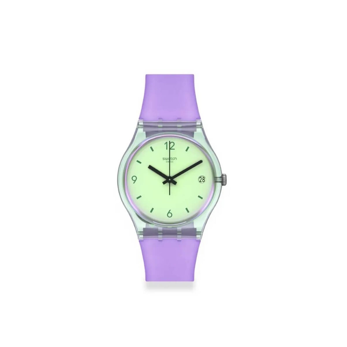 Swatch Mystic Sunrise-Uhr aus der May Collection-Kollektion mit Nur-Zeit-Funktion und Quarzwerk. Die Uhr besteht aus einem hellvioletten Silikonarmband und einem runden Gehäuse mit 34 mm Durchmesser aus transparentem grünem Material biologischen Ursprungs, Glas biologischen Ursprungs, das für einen fröhlichen Sonnenspektrumeffekt sorgt, und einem farbigen Zifferblatt. Weiß mit violetten Zeigern und Stundenmarkierungen . Grüner Schnallenverschluss.