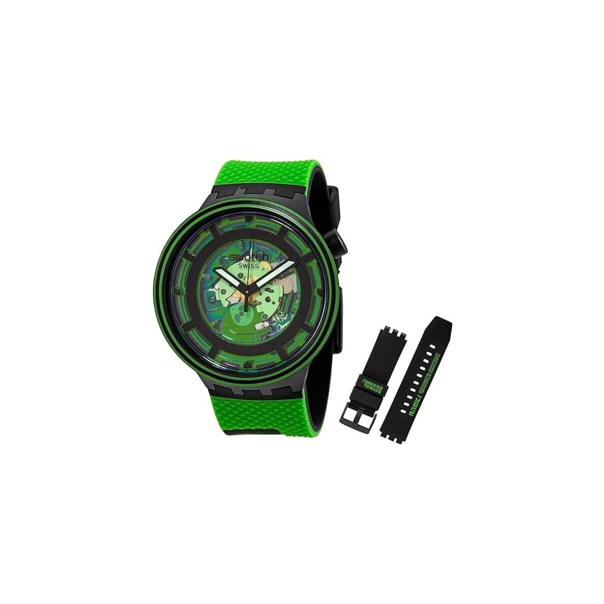 Swatch Come in Peace-Uhr, erhältlich mit zwei Silikonarmbändern, eines grün und das andere schwarz. Das transparente Zifferblatt mit mehrfarbigem Aufdruck, die mit Swatch Glow beleuchteten Zeiger.