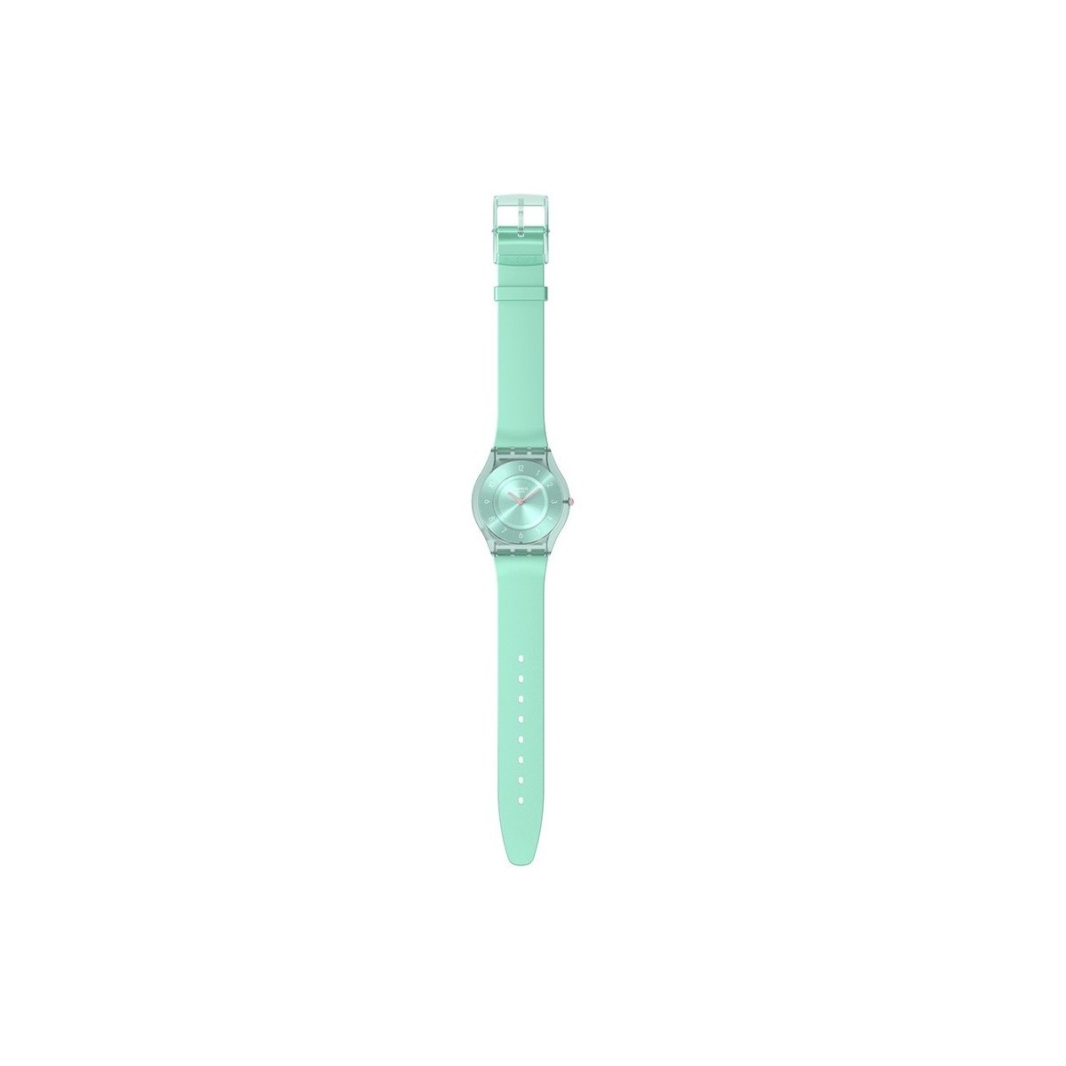 Pastellblaue Uhr aus der Skin-Kollektion „The January Collection“ mit grünem Zifferblatt und rosafarbenen Zeigern. Quarzuhr mit mintgrünem Silikonarmband. Die Transparenz und die Farben sind das Herzstück dieser eleganten und minimalistischen Uhr.