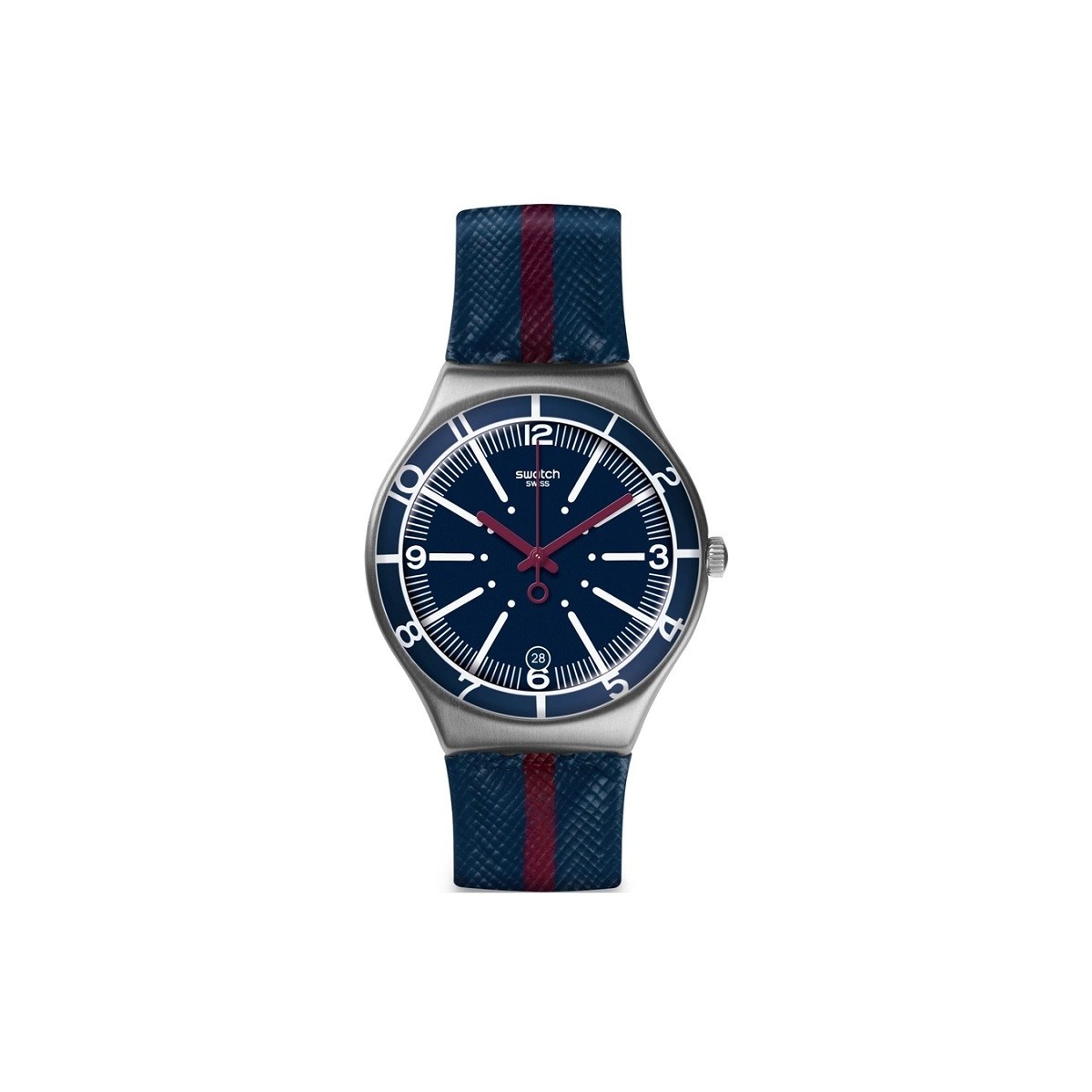 Blaues und rotes Leder Armband Edelstahl Gehäuse, blaues Zifferblatt und weißen Indizes