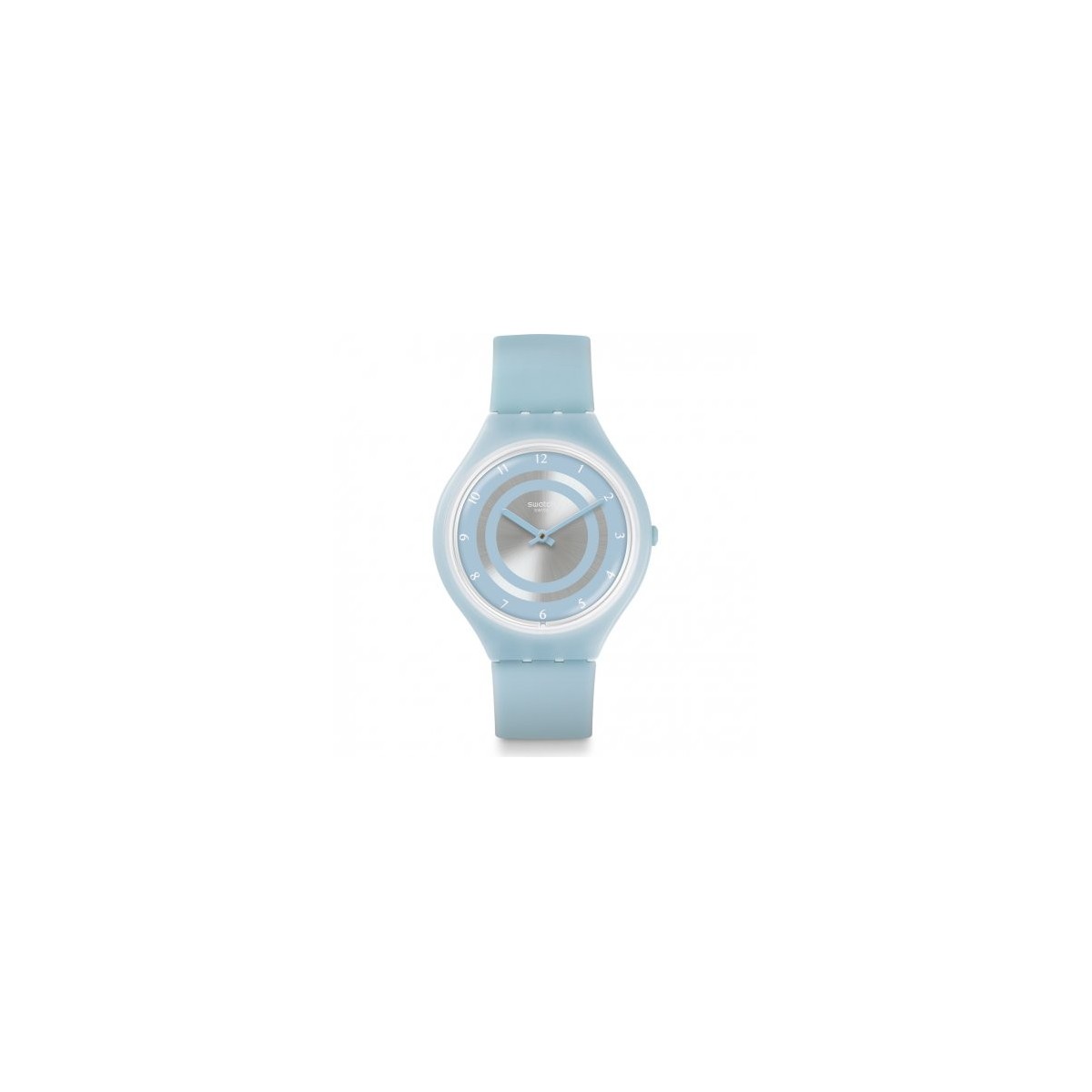 Ein Modell aus dem Gehäuse mit ultra-dünnen versilbert Zifferblatt mit blauen und weißen Indizes gebürstet. Das Kunststoffgehäuse von 36,8 mm besteht aus einem vorderen und einem hinteren weißen. Zur Ergänzung dieses zarte Muster finden wir ein Riemen mit Plastikschnalle und glänzenden blauen Matte Silikon.