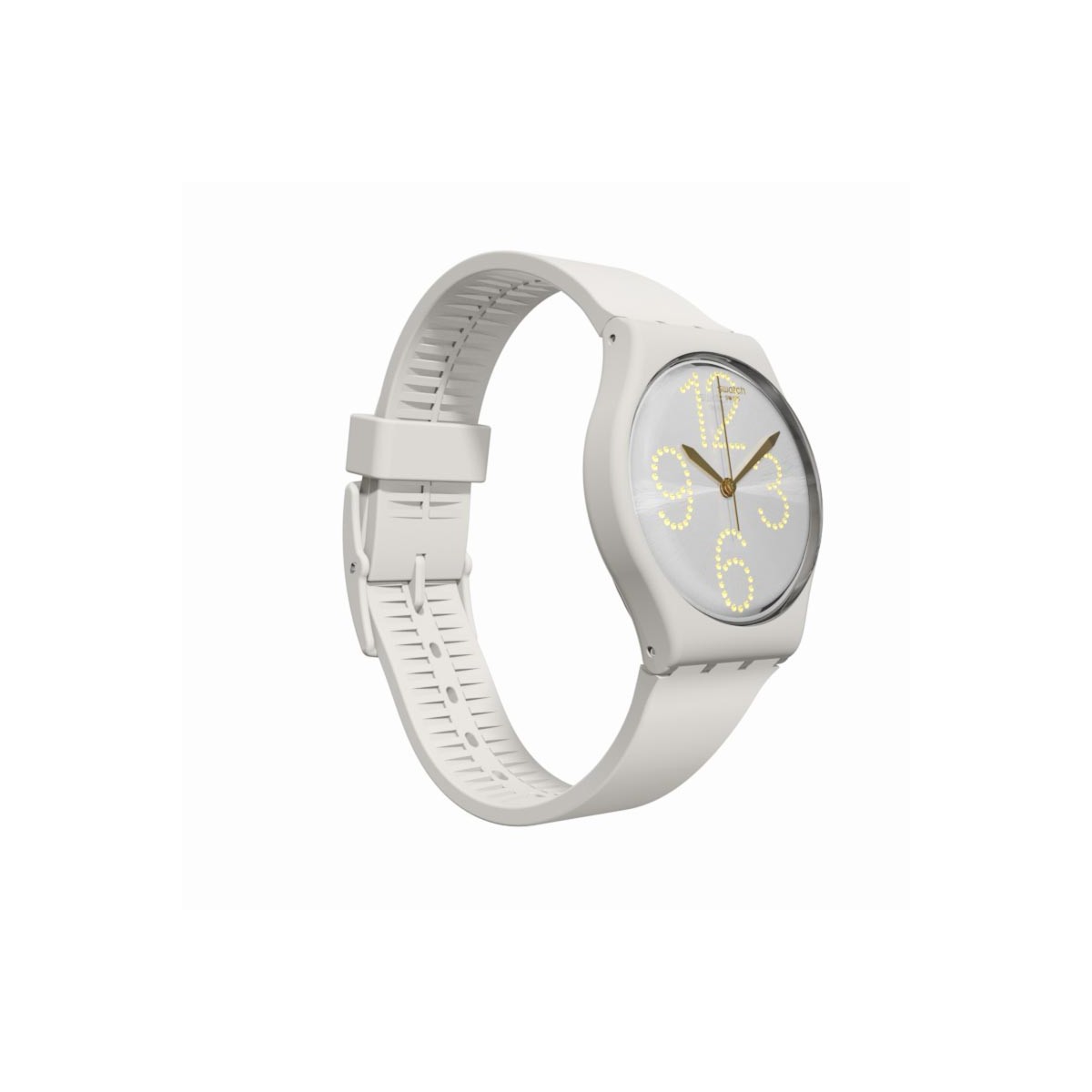 Unisex-Quarzuhr, silbernes gebürstetes Zifferblatt mit goldenen Lichtpunkten, beige Satin-Kunststoff-Etui, passend mit einem beige Silikon-Armband