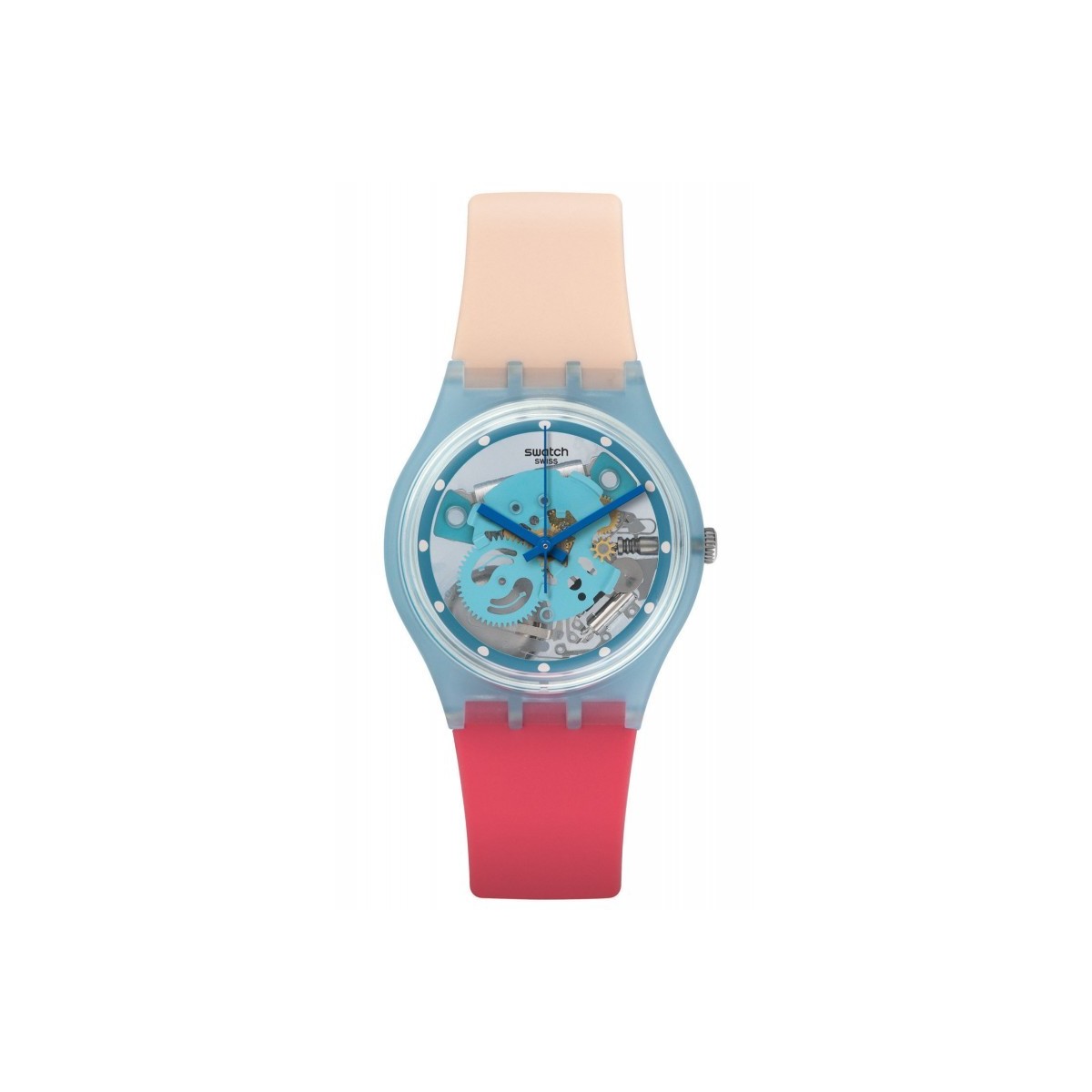 Damenuhr nur Polycarbonat Zeit mit transparentem Satin Kunststoff Fall. Zwei-Ton, seidig rosa und hellrosa Silikon-Armband; Visueller Mechanismus