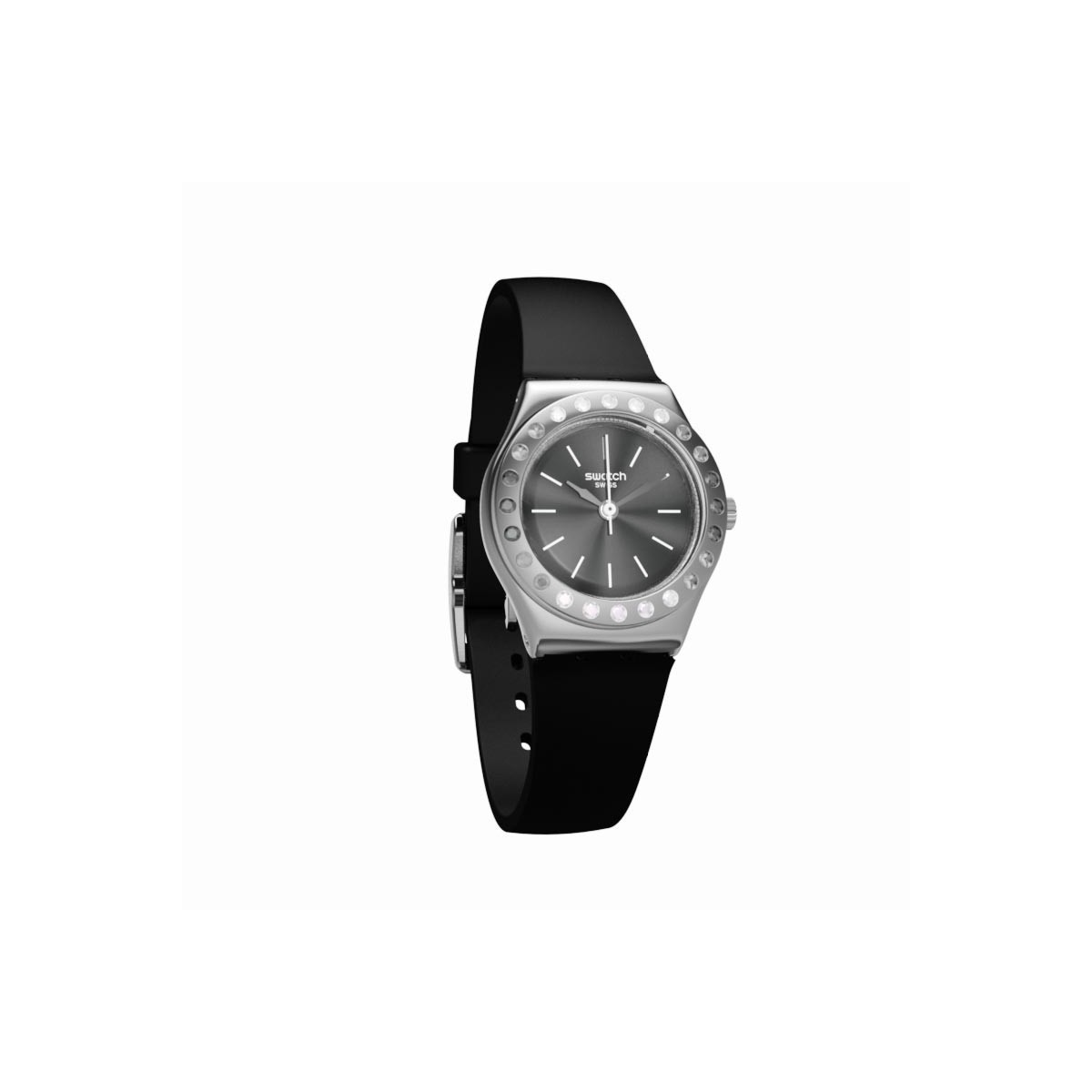 Schwarzes Zifferblatt mit weißen Indizes, umgeben von einer polierten Edelstahl-Lunette mit mehrfarbigen Kristallen und Brust in demselben Material. Der gleiche minimalistische Stil findet sich auf dem mattschwarzen Silikonband mit abgestimmtem Durchgang und glänzender Edelstahlschließe.