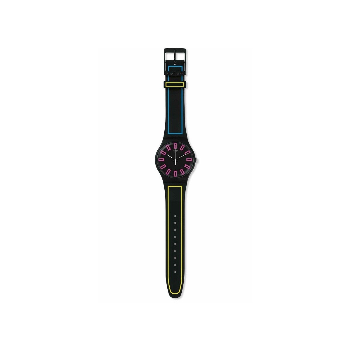 New Gent rund um das Armband 41 mm Die Swatch Vibe Kollektion mit schwarzem Zifferblatt mit violetten Indexen, Kunststoffgehäuse und mehrfarbigem geometrisch gemustertem Silikonband; Quarzwerk - SUOB146