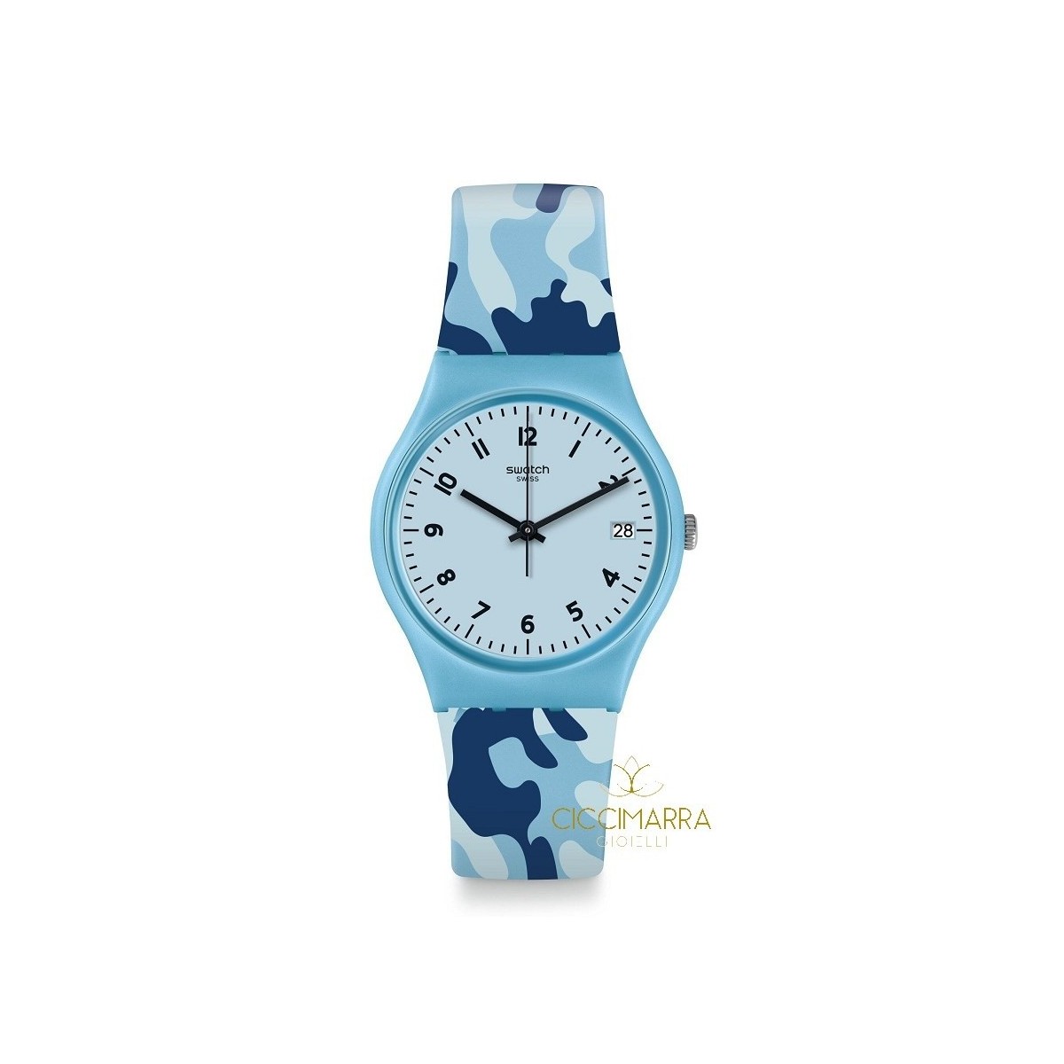 Starke und lustige Herrenuhr aus der Originals Gent Core Refresh-Kollektion mit blauem Silikonarmband und hellblauem Kunststoffgehäuse, hellblauem Zifferblatt mit schwarzen Indizes und Zeigern, Datumsanzeige bei 15 Uhr und Quarzwerk.