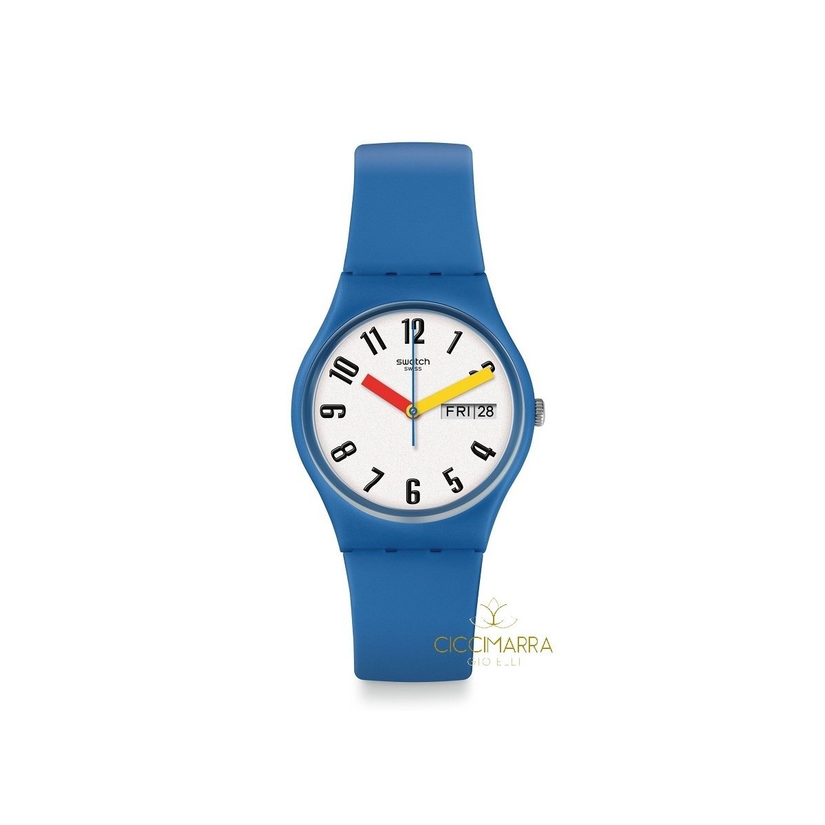 Super dynamische Herrenuhr aus der Bau Swatch Originals Gent Kollektion mit Silikonarmband und blauem Kunststoffgehäuse, weißem Zifferblatt mit gelben und roten Zeigern, schwarzen Zahlen, Quarzwerk und Datum bei 15 Uhr.