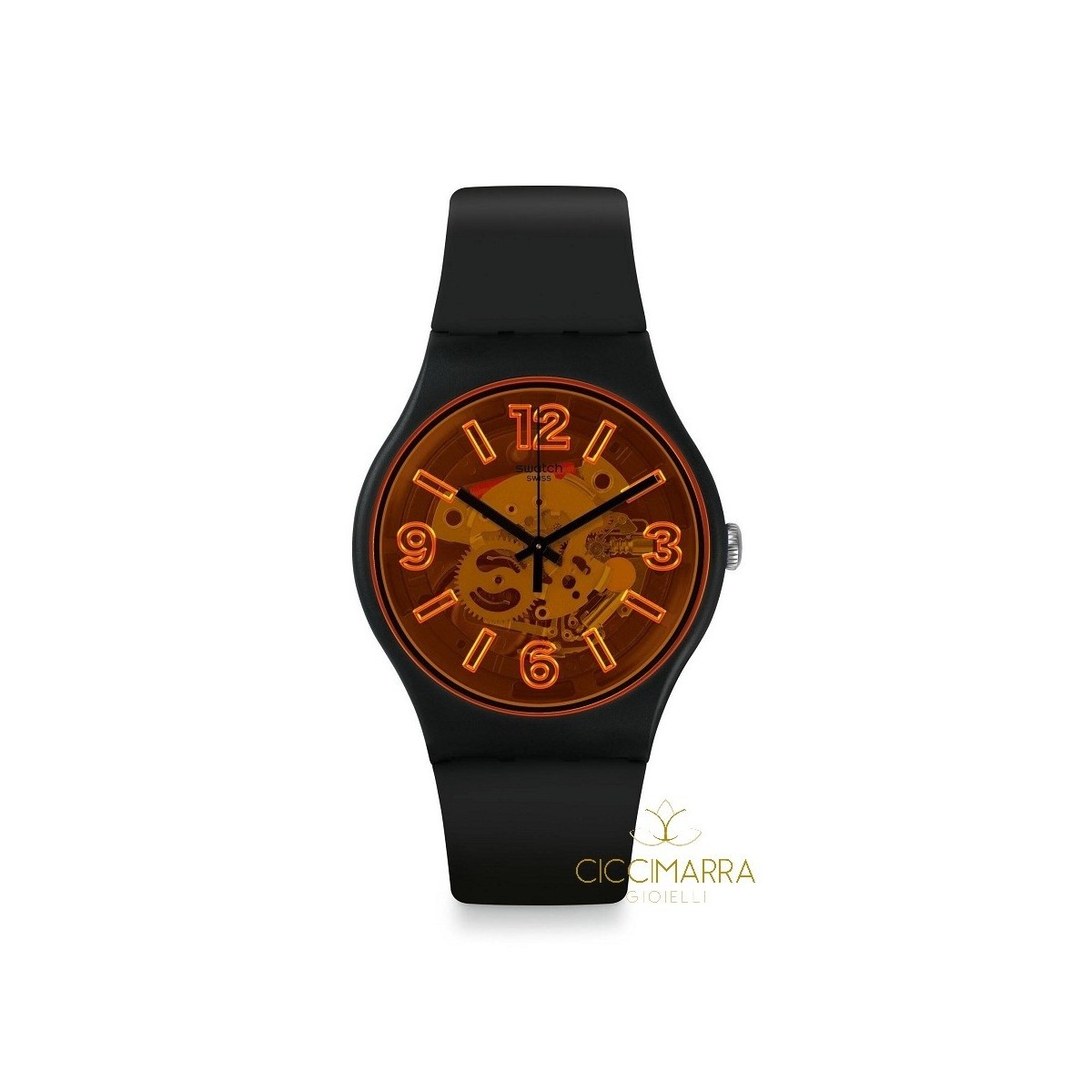 Herrenuhr aus der Originals New Gent Kollektion Bau Swatch mit Silikonarmband und schwarzem Kunststoffgehäuse, transparentes oranges Zifferblatt mit sichtbarem Quarzwerk