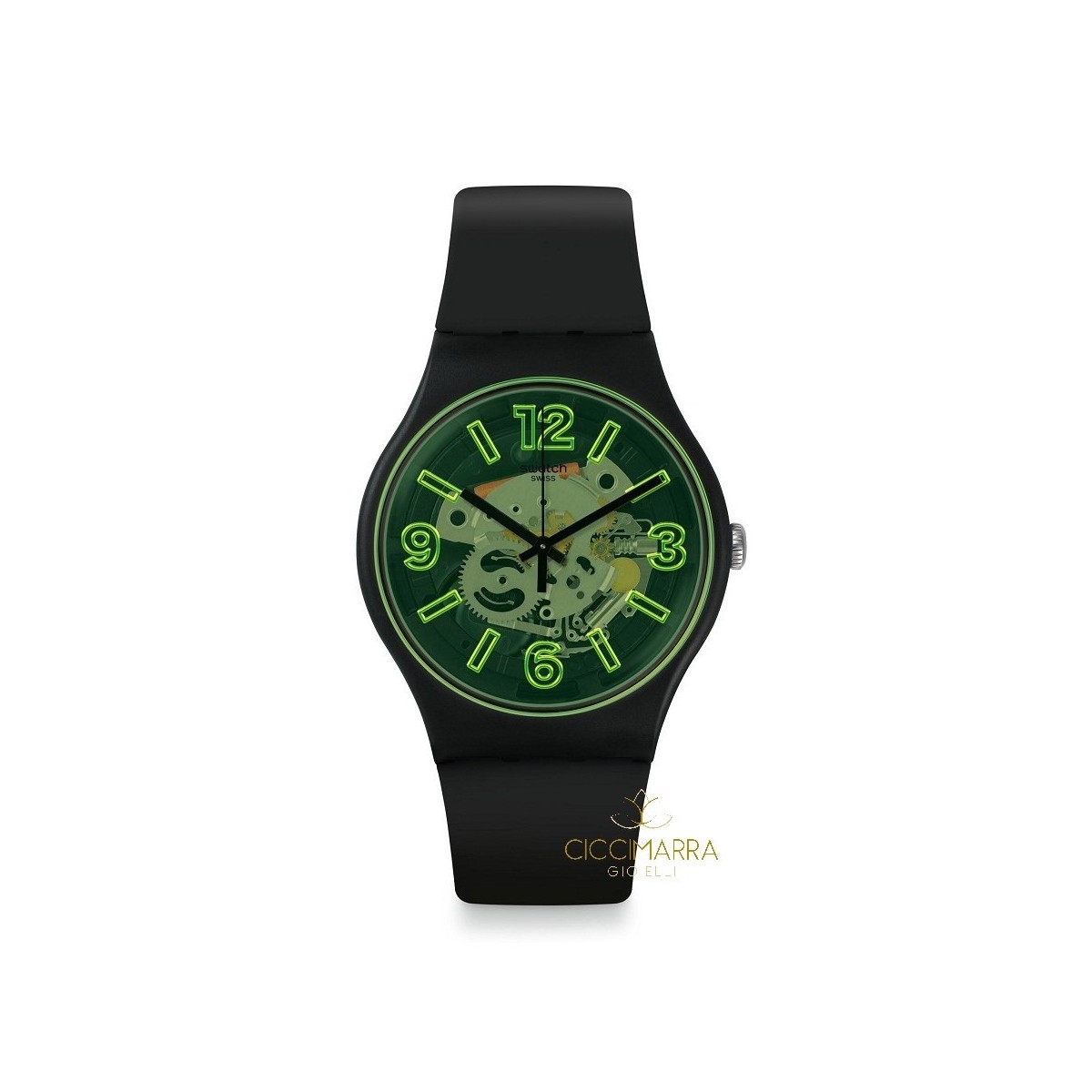 Bau Swatch Collection Herrenuhr mit zweifarbigem Silikonarmband in Schwarz und Gelb und schwarzem Kunststoffgehäuse, transparentem gelbem Zifferblatt mit sichtbarem Quarzwerk, neongelben Indizes und schwarzen Zeigern.