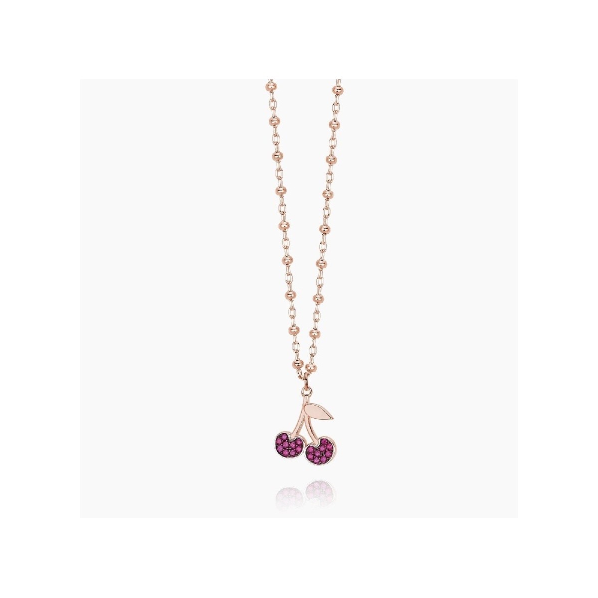 Halskette im Rosenkranzstil aus Rosensilber mit einem kirschförmigen Anhänger, der mit synthetischen Rubinen mit brünierten Krallen und einem Karabinerverschluss verziert ist.
