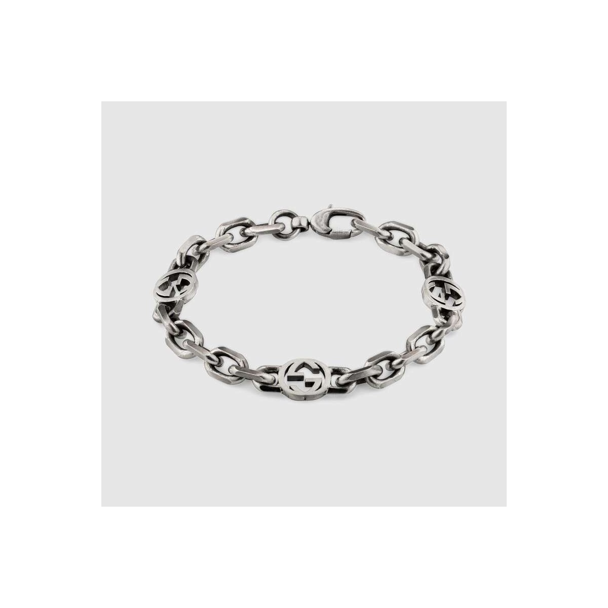 Dieses Kettenarmband aus Silber mit antikem Finish wird durch das Interlocking G-Symbol aus den Archiven des Hauses definiert. Das Detail des Monogramms ist eine Hommage an den Gründer der Marke, Guccio Gucci, und verleiht dem Logo eine subtile Konnotation.