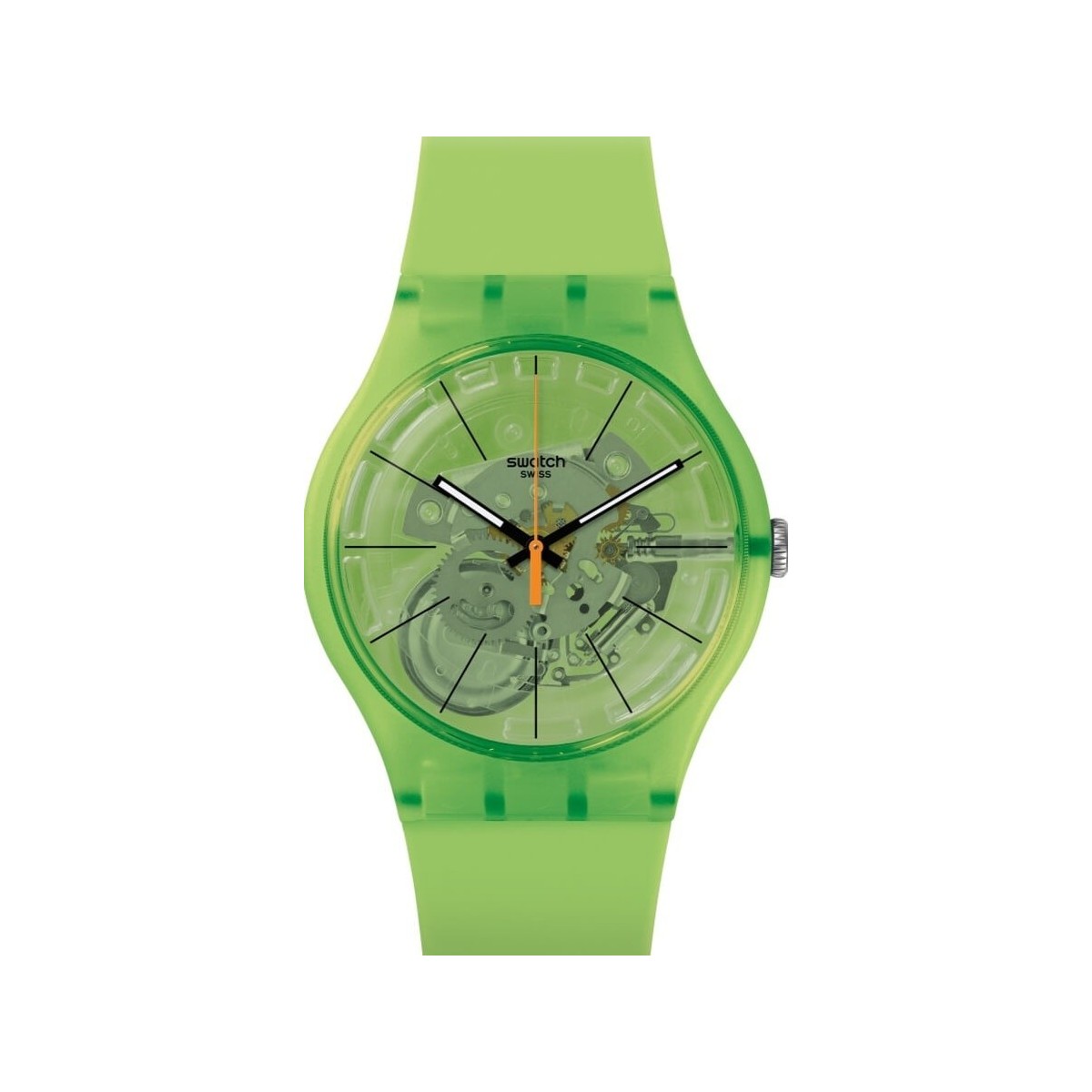 Beobachten Sie Mann Frau der Herbst Winter New Gent Kollektion mit Silikonarmband und hellgrünem Kunststoffgehäusesymbol der Hoffnung und Bestimmtheit. Grün steht für Kraft und Gleichgewicht und gibt positive Schwingungen ab. Das durchscheinende Zifferblatt zeigt das sichtbare Quarzwerk, während das Satin-Silikonarmband einen Hauch von Frische verleiht.