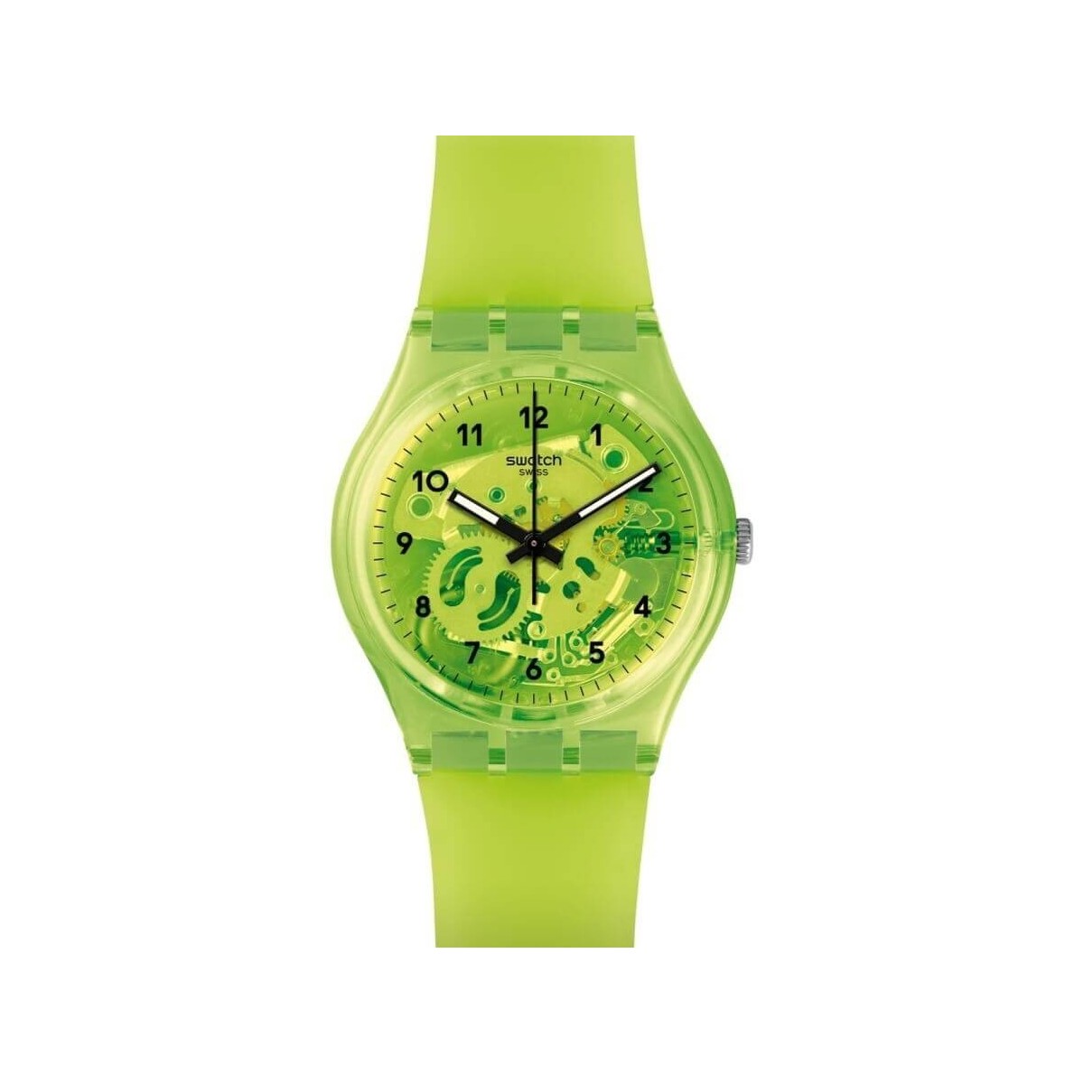 Beobachten Sie Mann Frau der Herbst Winter Swatch Essentials Kollektion mit fluo grünem Satin Silikonarmband und transparentem Gehäuse der gleichen Farbe mit schwarzen Zahlen und farbigem und durchscheinendem Zifferblatt mit sichtbarem Quarzwerk.