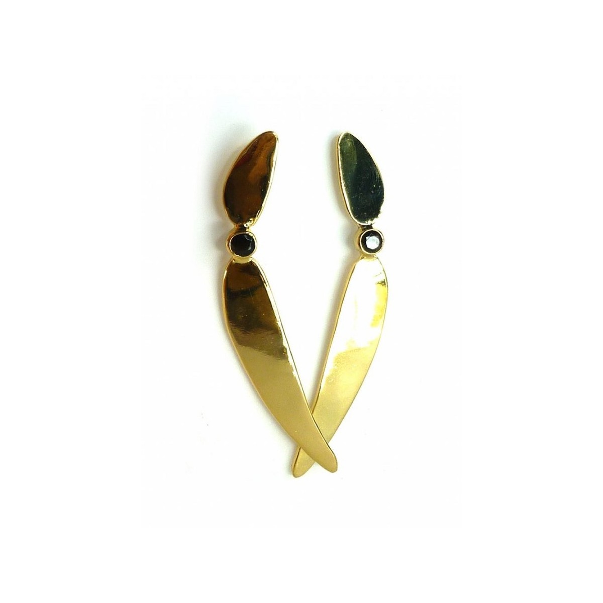 Ohrringe der Flusslinie Anhänger mit einem Schmetterling Verschluss durch zwei Tropfen gekennzeichnet in der Mitte von einem Onyx verbunden. 23.5 Karat vergoldetes Messing.