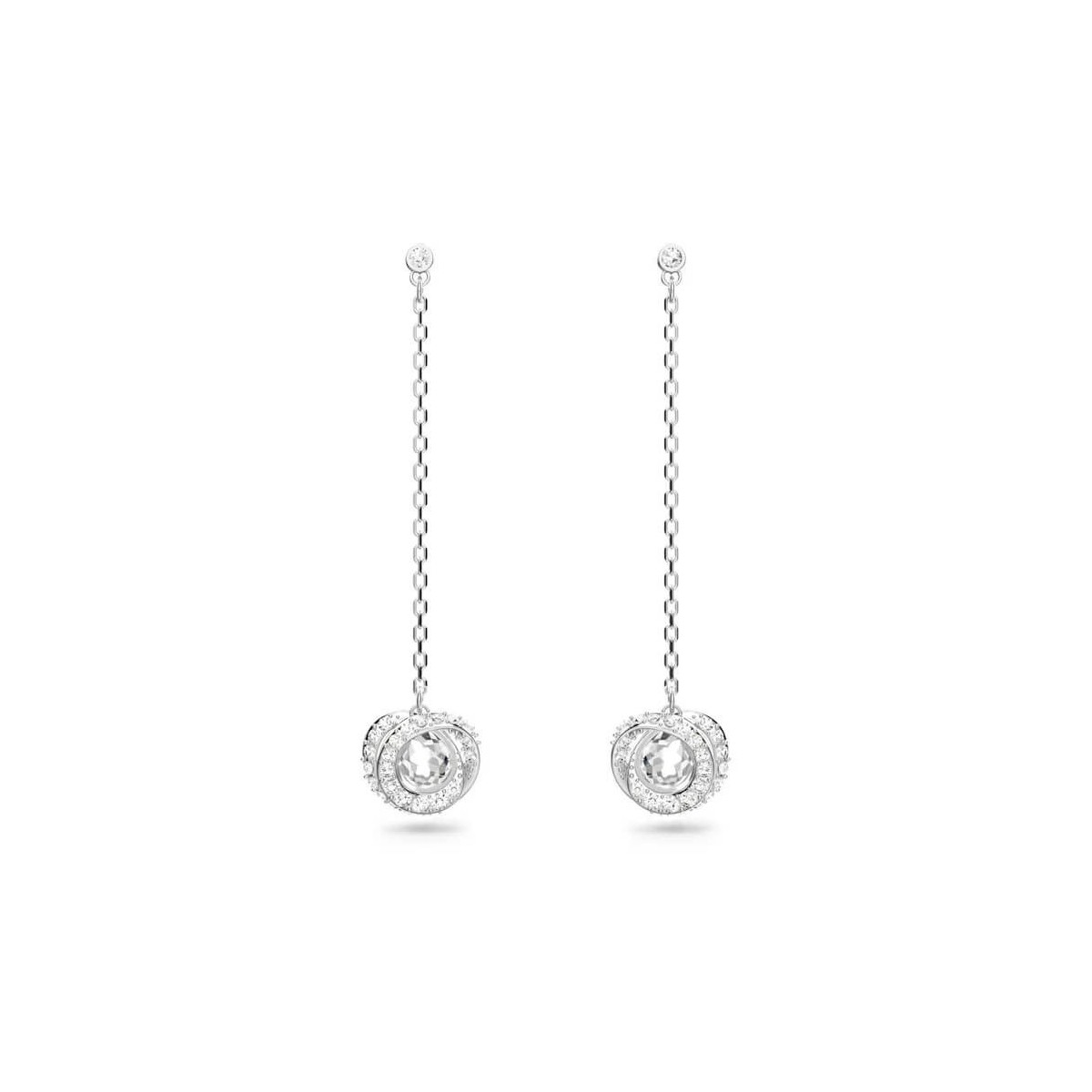 Damen-Anhängerohrringe aus der Generation-Kollektion aus rhodiniertem Metall mit einem Anhänger, der das traditionelle Handwerkssymbol des österreichischen Unternehmens enthält, mit Tropfenkristall, der in zwei Spiralkreise mit weißem Zirkonia-Pavé eingefasst ist.