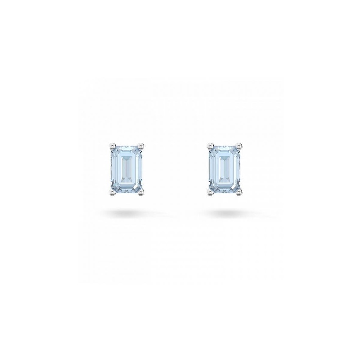 Swarovski Damenohrringe aus der Stilla-Kollektion. Lappenschmuck aus rechteckig geschliffenem Kristall in einem zarten Blauton, in Krallen auf Rhodinierung montiert. Es verleiht dem Gesicht des Trägers Glanz.