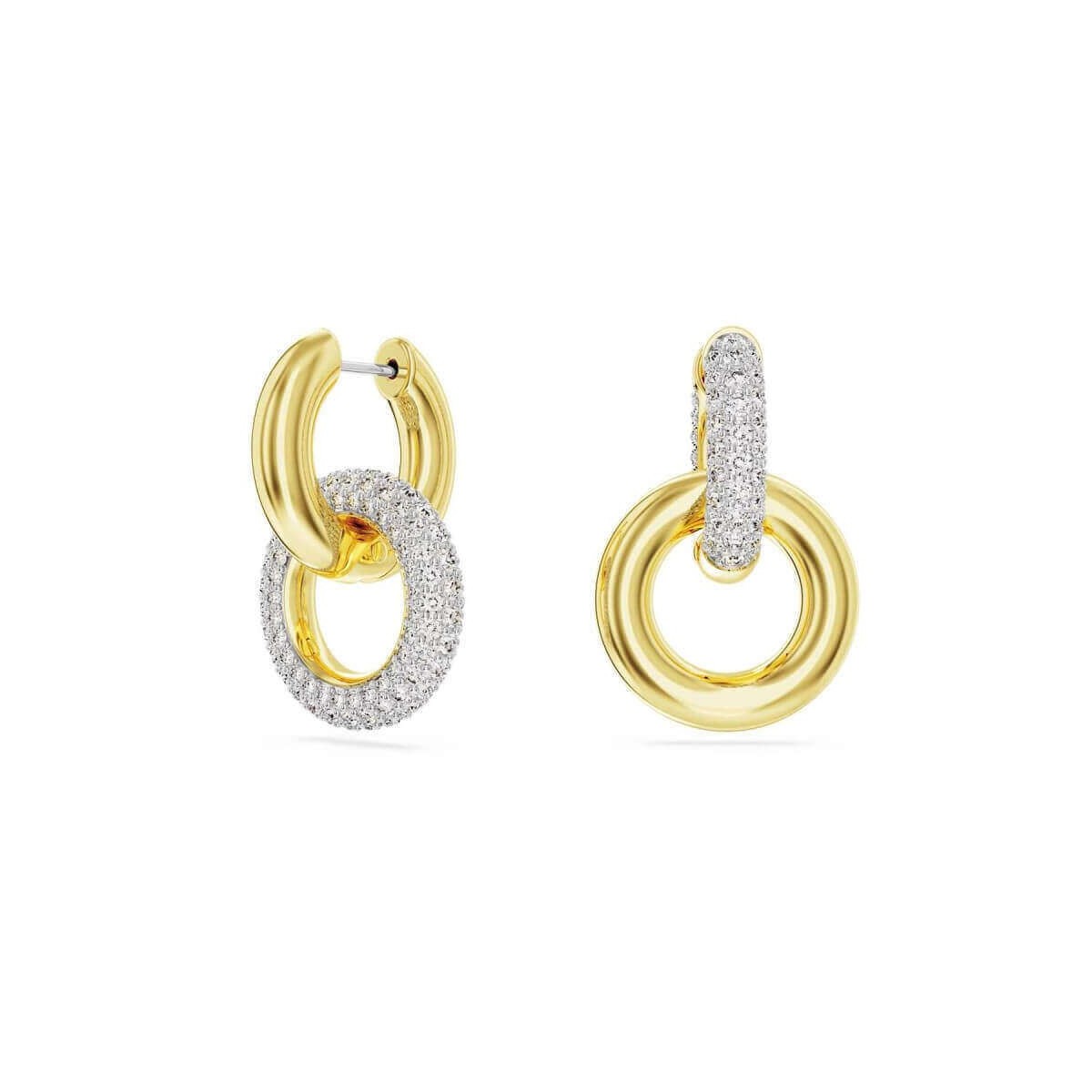 Die Damenohrringe von Swarovski aus der Dextera-Kollektion in Kreisform bestehen aus zwei gelbvergoldeten röhrenförmigen Ringen, einer davon mit Allover-Pavé. Um einen asymmetrischen Touch zu verleihen, ist die Platzierung der Ringe bei jedem Teil unterschiedlich. Für zusätzliche Vielseitigkeit können Sie den zweiten Ring abnehmen, um einen einzelnen Ringstil zu erhalten.