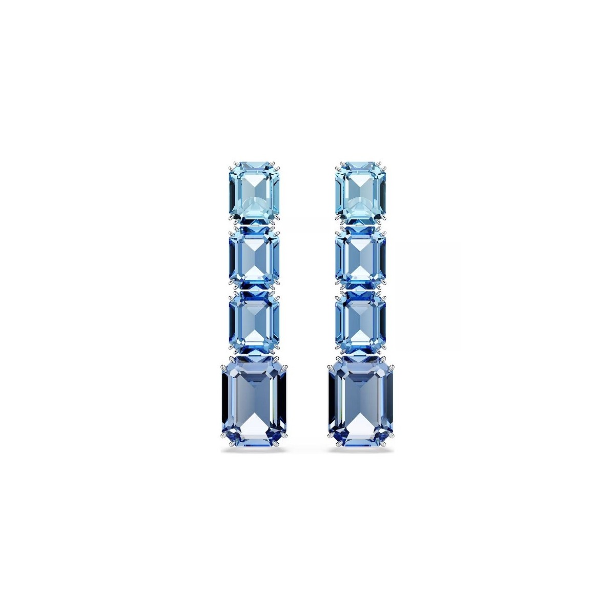 Ohrhänger der Linie Millenia, rhodiniert und mit blauen Kristallen im Achteckschliff. Pin-Verschluss.