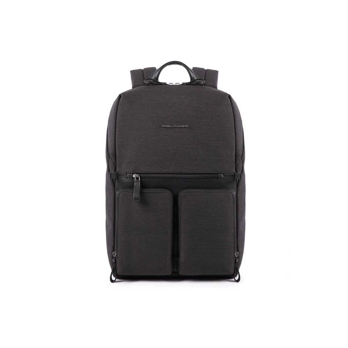 Herren-Stoffrucksack aus der Tiros-Kollektion in Schwarz mit Computer-Steckfach. Tiros ist eine Kollektion, die aus 100% recyceltem Stoff aus Kunststoff entwickelt wurde und eine informelle Stilkollektion mit Details aus Kalbsvollleder mit leicht granatrotem und wolkigem Aussehen sowie metallischen Accessoires aus mattem Rotguss.