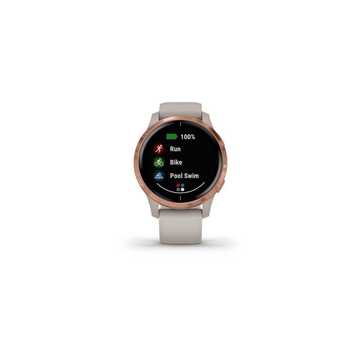 Uhr Garmin Venu, mit roségoldenem Gehäuse und hellsandfarbenem Armband, mit hellem AMOLED-Bildschirm mit einer Autonomie von bis zu 5 Tagen mit einer einzigen Ladung. 20 Sport-Apps stehen zur Verfügung, dank Trainer auch animierte Clips mit den Übungen dazu. Mehr Gesundheitsstatistiken und alle Ihre Lieblings-Playlists auf Ihrem Handgelenk.