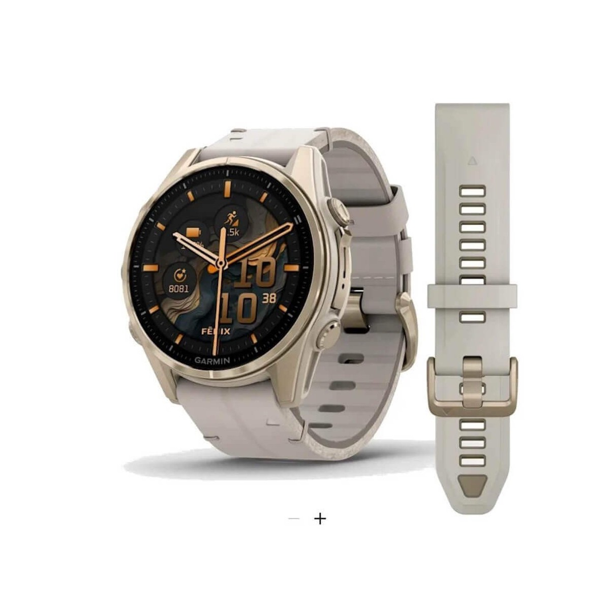 Fenix 8-Linien-Multifunktions-Smartwatch mit hellem Amoled-Display und Saphirglas. Doppeltes Armband aus beigem Kautschuk und sandfarbenem Leder. 43-mm-Gehäuse aus weichem Goldtitan