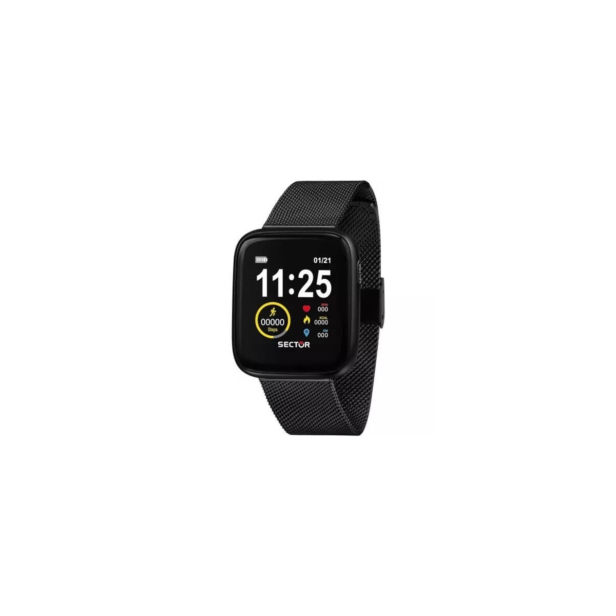 Smartwatch Sector aus der S-04-Kollektion mit rechteckigem Gehäuse von 40 x 34,5 mm aus Metalllegierung, Mineralglas und schwarzem Milanaise-Metallarmband, mit Clip- und Hakenverschluss und digitalem Uhrwerk mit Bluetooth zur Verbindung mit dem Mobiltelefon , um mehrere Funktionen zu nutzen, wie GPS, Fernsteuerung von Musik und Kamera, Herzfrequenz, Unterstützung des Sportmodus, Berechnung des Kalorienverbrauchs, Blutsauerstoffversorgung, Schlafüberwachung, Stoppuhr und Wetter. Integriertes Mikrofon und Lautsprecher, Sie können Anrufe direkt von der Smartwatch entgegennehmen oder ablehnen / stumm schalten.