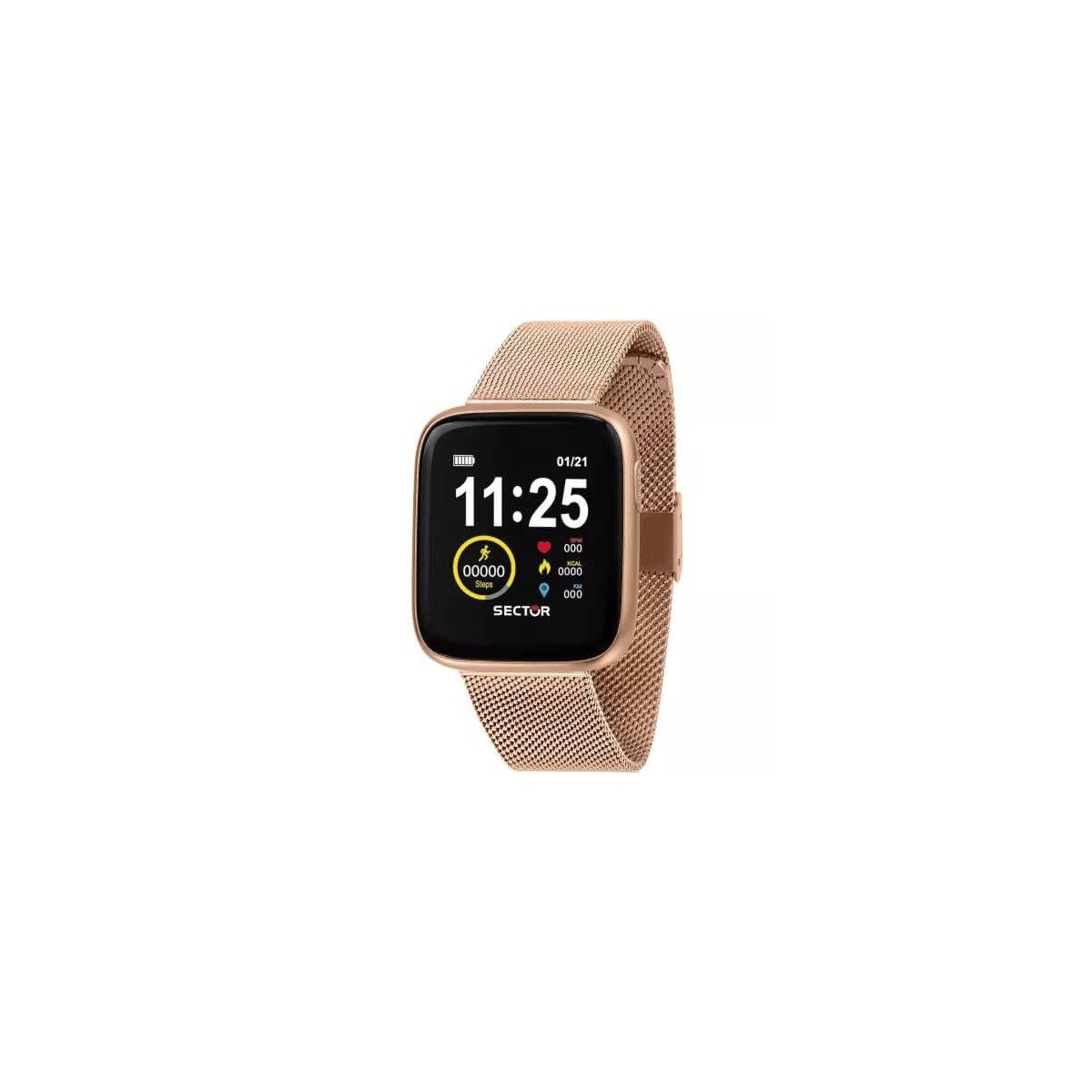 Smartwatch Sector aus der S-04-Kollektion mit einem rechteckigen Gehäuse von 40 x 34,5 mm aus Metalllegierung, Mineralglas und roségoldfarbenem Mailänder Mesh-Armband, mit Clip- und Hakenverschluss und digitalem Uhrwerk mit Bluetooth zur Verbindung mit dem Mobiltelefon Telefon, um mehrere Funktionen zu nutzen, wie GPS, Fernsteuerung von Musik und Kamera, Herzfrequenz, Unterstützung des Sportmodus, Berechnung des Kalorienverbrauchs, Blutsauerstoffversorgung, Schlafüberwachung, Stoppuhr und Wetter. Integriertes Mikrofon und Lautsprecher, Sie können Anrufe direkt von der Smartwatch entgegennehmen oder ablehnen / stumm schalten.