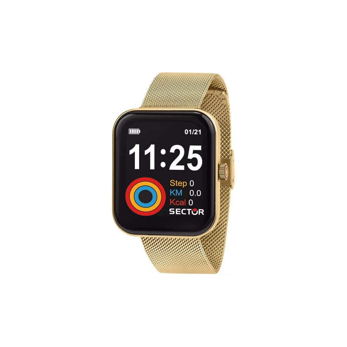 Sector Unisex-Smartwatch-Uhr aus der S-03-Kollektion mit einem Mailänder Mesh-Armband aus gelbvergoldetem Stahl, einem rechteckigen 46,5-mm-Gehäuse und einem farbigen Zifferblatt mit Touchscreen-Modus. Digitales Uhrwerk mit Bluetooth-Verbindung zur Verbindung mit dem Mobiltelefon. Verschluss mit Clip und Haken. Kompatibel ab Android 6 und iOS 10