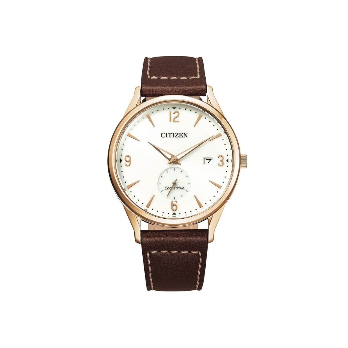 Klassische Herrenuhr aus der Small Seconds-Kollektion mit Eco-Drive Solaraufzugswerk, vergoldetem Stahlgehäuse und braunem Lederarmband mit Datumsanzeige, weißem Zifferblatt mit Zeigern, Indexen und goldenen Zahlen. Der kleine Ball, der die um 6 Uhr positionierten Sekunden markiert, fällt in dieser Sammlung sofort auf.