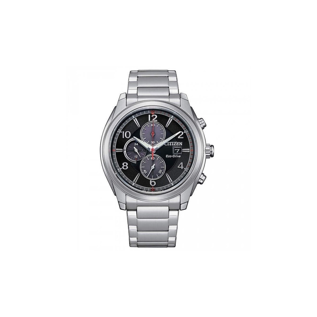 Citizen Herrenuhr, aus der Crono Sport Kollektion, mit Chronographenfunktion und Eco-Drive Uhrwerk, solarbetrieben mit einer Gangreserve von bis zu 9 Monaten. Uhr aus poliertem und satiniertem Edelstahl 316L mit Gliederarmband, 43 mm Gehäuse mit verschraubtem Boden und schwarzem Zifferblatt mit abwechselnden Indizes und arabischen Ziffern, Zeigern mit LumiBrite und rotem Sekundenzeiger. Faltschließe.