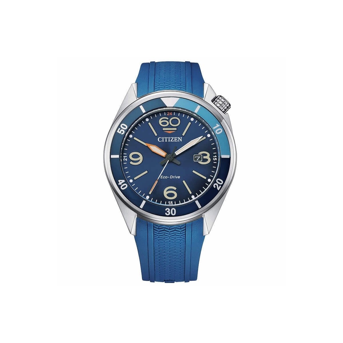 Herrenuhr, Seaplane-Linie, mit Zeitfunktion und Eco-Drive-Solaruhrwerk, blaues Silikonarmband, 44-mm-Gehäuse mit blauem Zifferblatt. Schnallenverschluss.