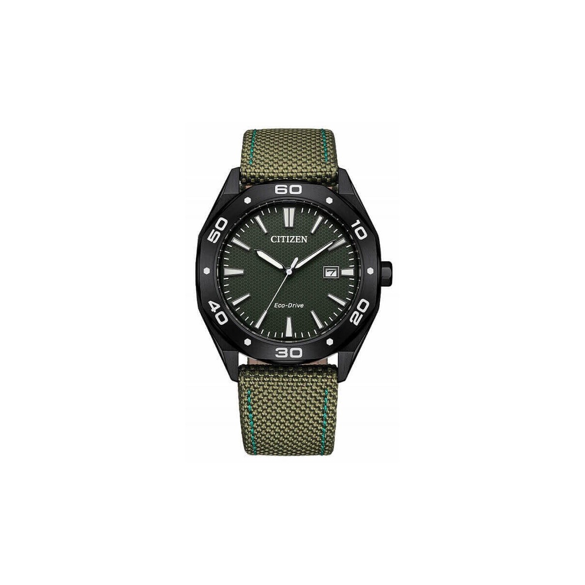 Herrenuhr, Linie Metropolitan Sport, nur Zeitanzeige mit Eco-Drive-Uhrwerk, grünem Stoffarmband, brüniertem achteckigem Gehäuse und grünem Zifferblatt.