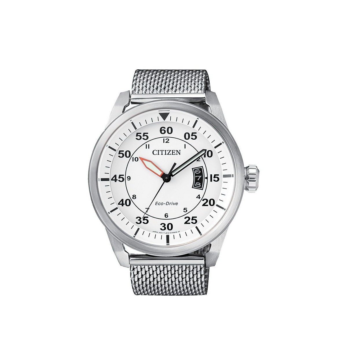 Solar Uhr mit nur Zeit mit Datum Citizen Eco-Drive Kollektion mit Edelstahlgehäuse und Armband, White Dial und weißen Hände und Orange.